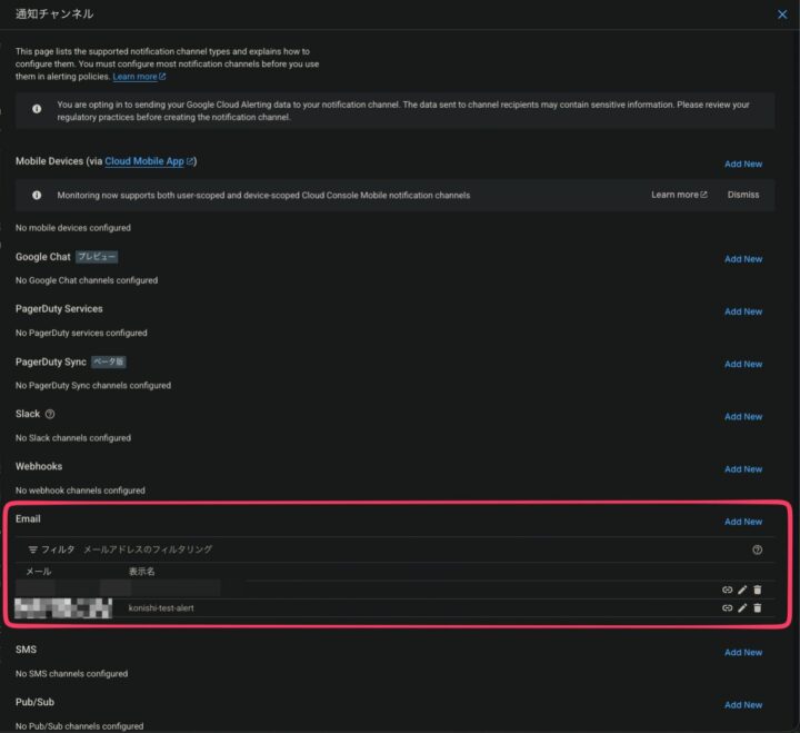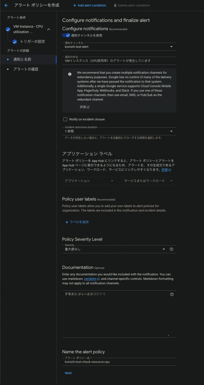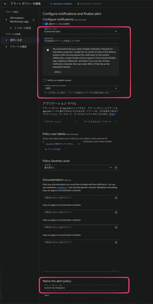 通知チャンネルとIncident autoclose durationは死活監視と同じ、通知件名とアラートポリシー名は適宜設定します