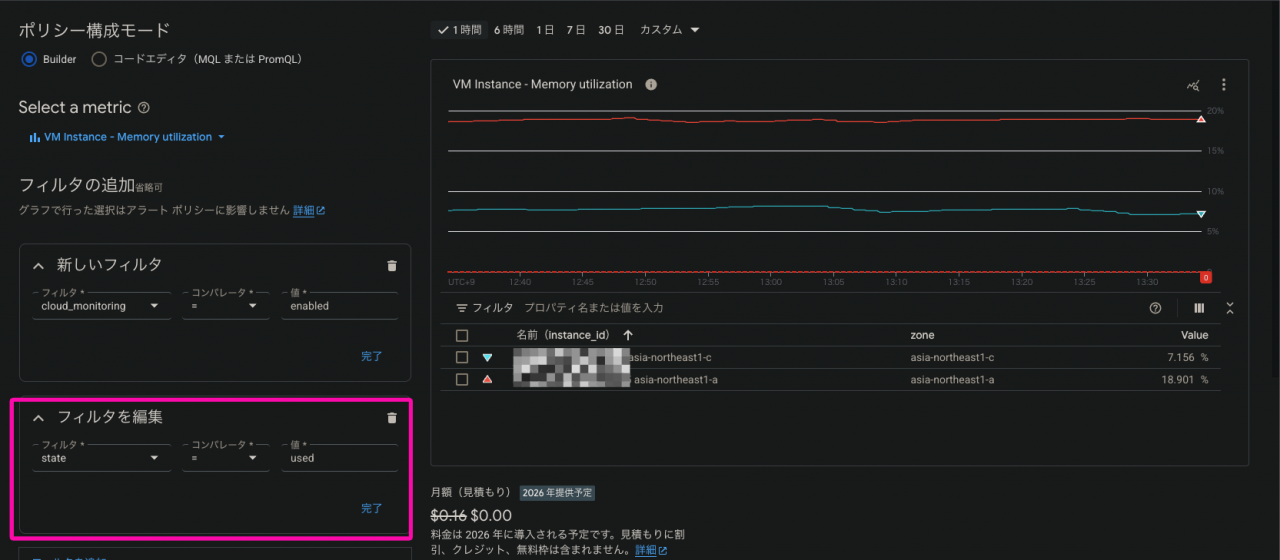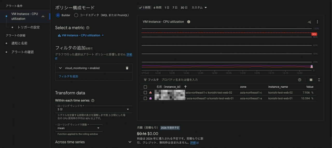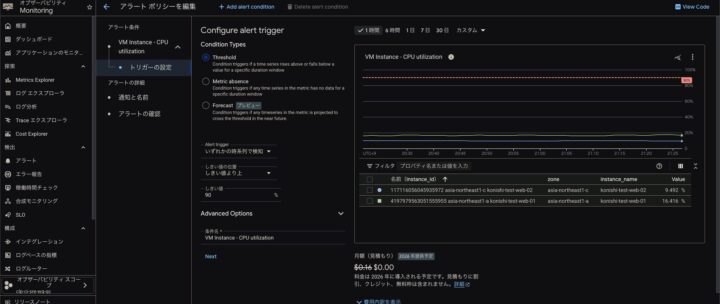 メトリクスはVM Instance > instance > CPU utilizationを選びます