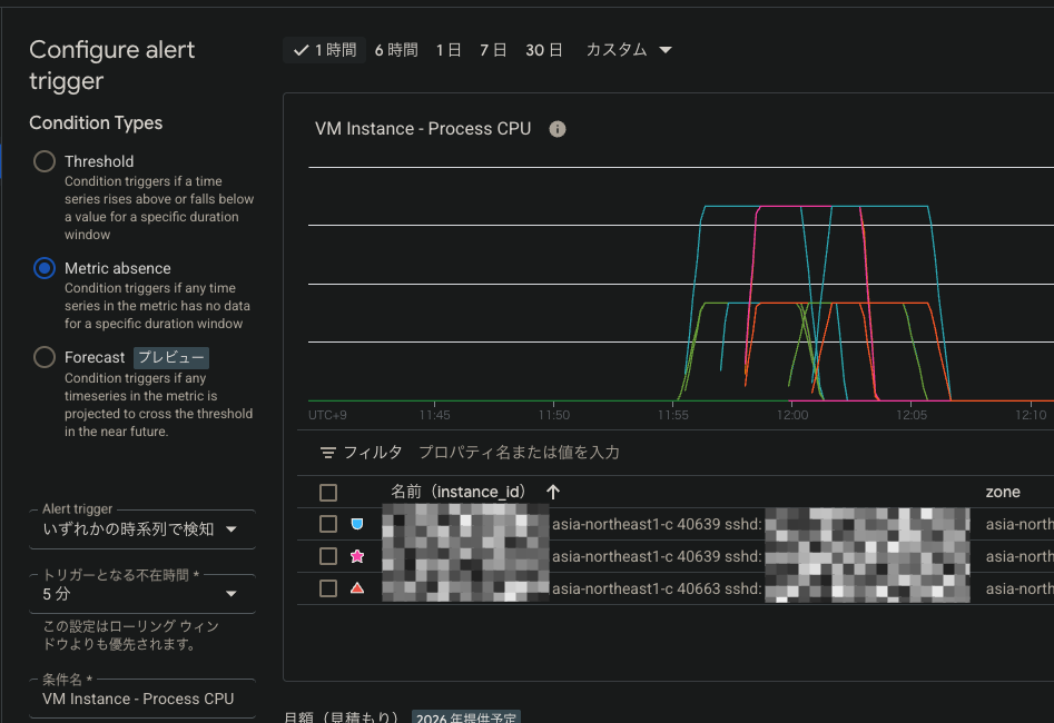 - 閾値:プロセスが停止=ログがない、でアラートを上げたいので「Metric absence」を選択