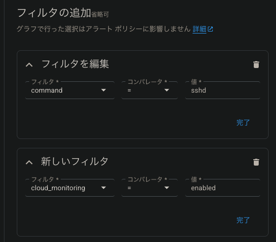 | Compute Engine (Debian) | sshdプロセス | プロセス数 0 |