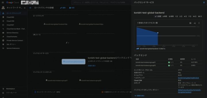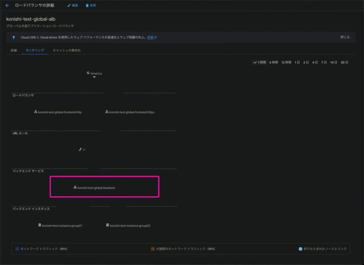 こちらはロードバランシング > 情報を見たいロードバランシングを選んで「モニタリング」を開き、詳細を開くとバックエンドサービスの状態が確認できるので、これを監視します