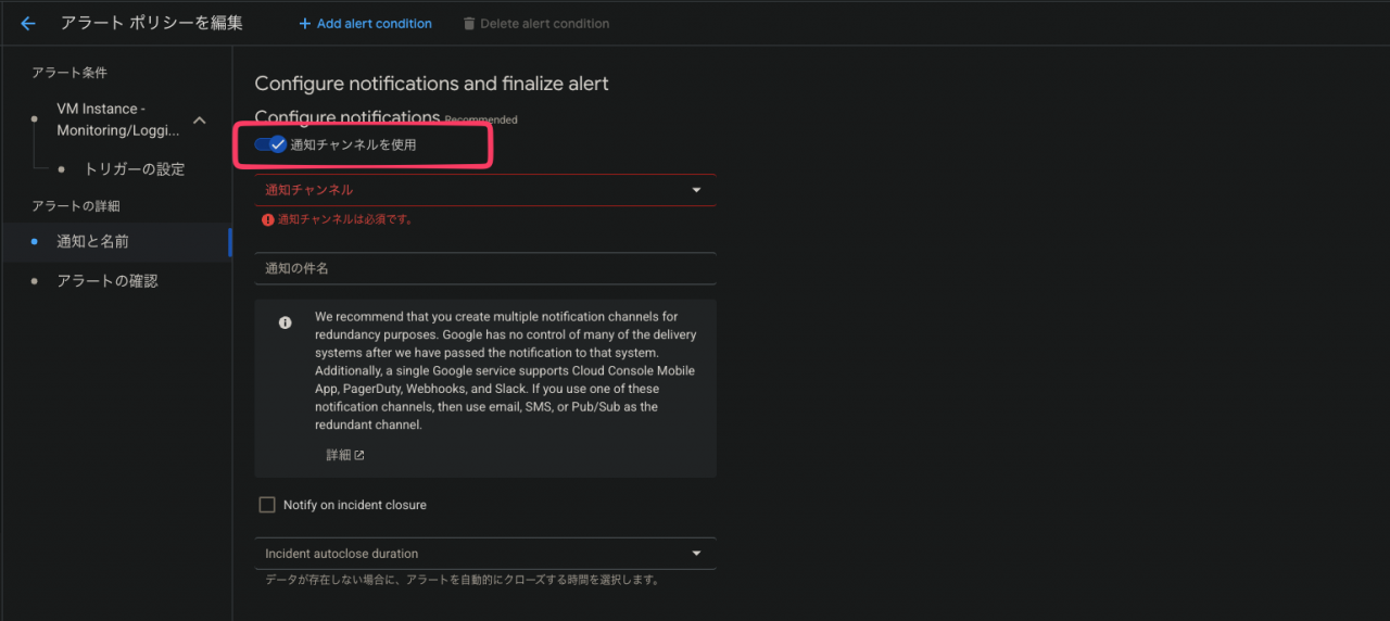 作成した通知チャンネルと通知件名、Incident autoclose duration(一定期間メトリクスが届かなければアラートをクローズする)、アラートポリシー名を設定します