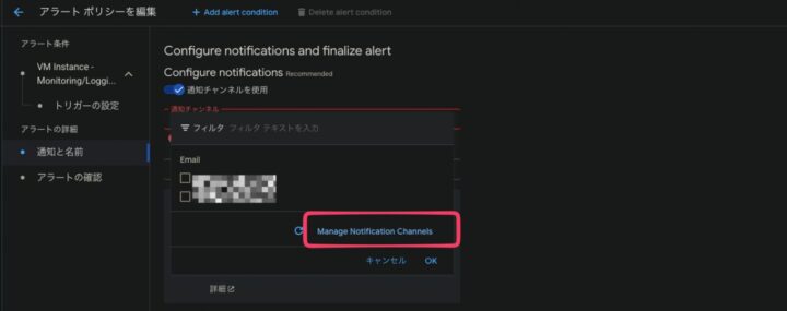 新規で通知チャンネルを設定する場合は、通知チャンネルの欄を開き、「Manage Notification Channels」を開きます