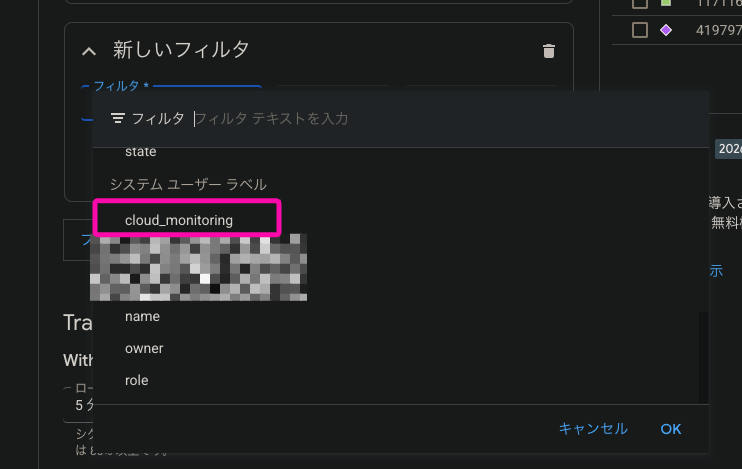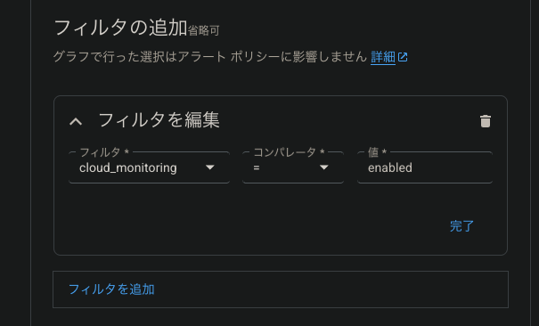 - フィルタ:cloud_monitoring:enabledのラベルで絞り込み