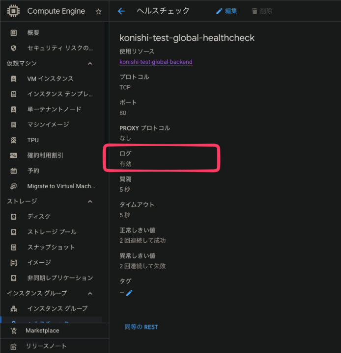 Compute Engine > ヘルスチェック > 監視したいヘルスチェックの詳細画面を開き、「ログ」部分を確認する