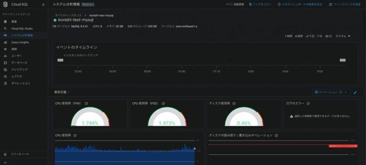 CloudSQLは元々Google Cloudがメトリクスを取得してくれており、CloudSQL > 情報を見たいインスタンスを選んで「システム分析情報」のタブを開くと、画像のようにメトリクスを確認できます。今回、対象の監視項目はすでにメトリクスが取得できているようでした(画像では見切れていますが、このページの下の方にメモリ使用率のグラフがあります)