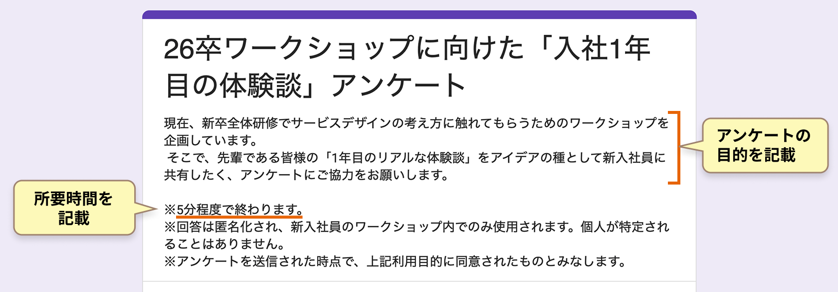 最初に「これは何のためのアンケートで、どれくらい時間がかかるか」を伝えて警戒心を解きます。