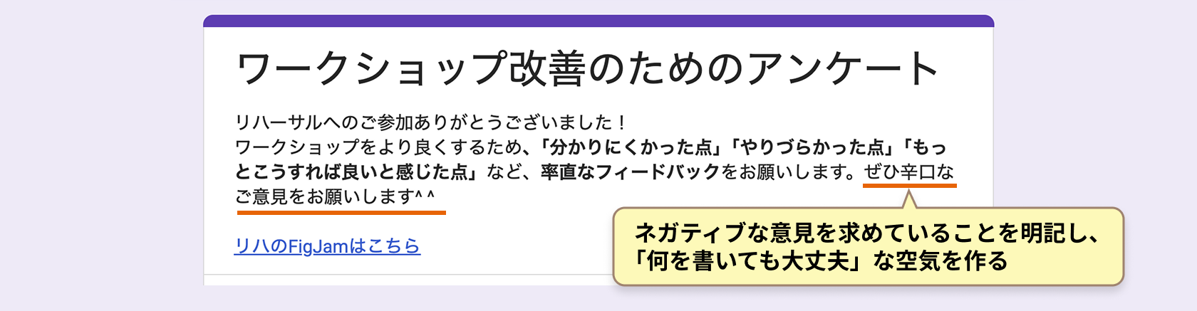 改善のための課題を抽出したい場合は、「ぜひ辛口なご意見をお願いします」と明記し、些細な不満でも書きやすい空気を作りましょう。
