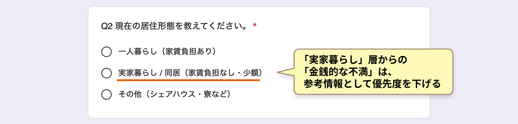 「実家暮らし」層からの「金銭的な不満」は、参考情報として優先度を下げる、といった判断材料にします。