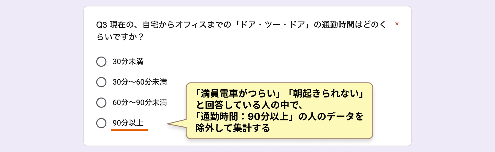 具体例2:Q. 自宅からオフィスまでの通勤時間はどのくらいですか?