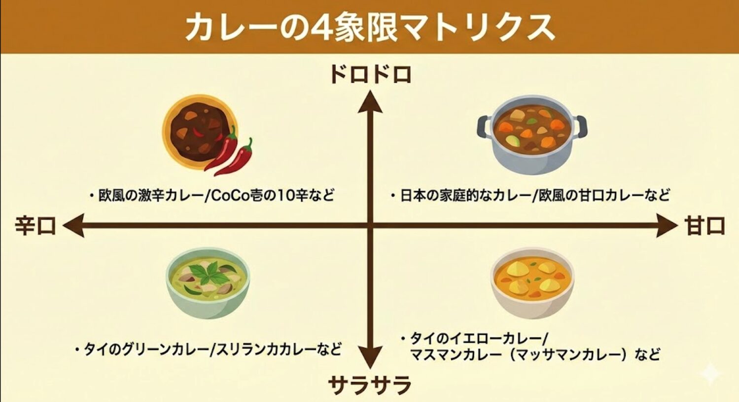 - タイのグリーンカレー/スリランカカレー: 「辛口」かつ「サラサラ」なので左下のエリア