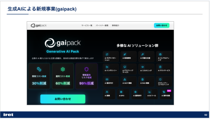 2025年10月には企業の生成 AI 導入・活用における包括的な課題をワンストップで解決する AI 統合ソリューション群「gaipack(ジーエーアイパック)」の提供を開始。AI に関する企業の多様なニーズに対応し、課題を解決へ導いています。