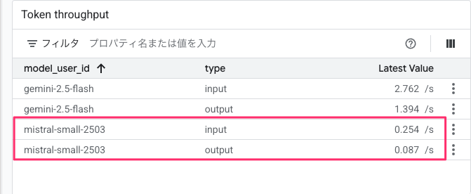 Token throughput より mistral-small-2503 のトークン消費の存在が確認できました。