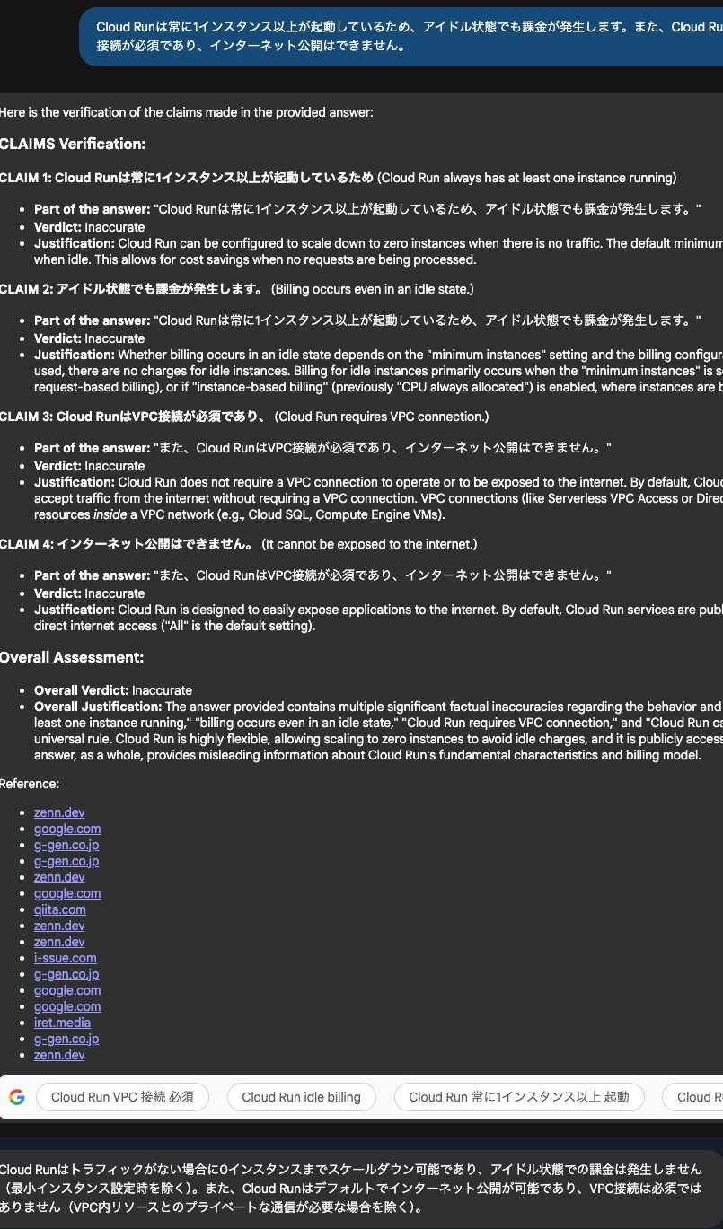 入力内容の正否を調査した上で、調査結果に基づく Cloud Run に関する情報を出力してくれています。