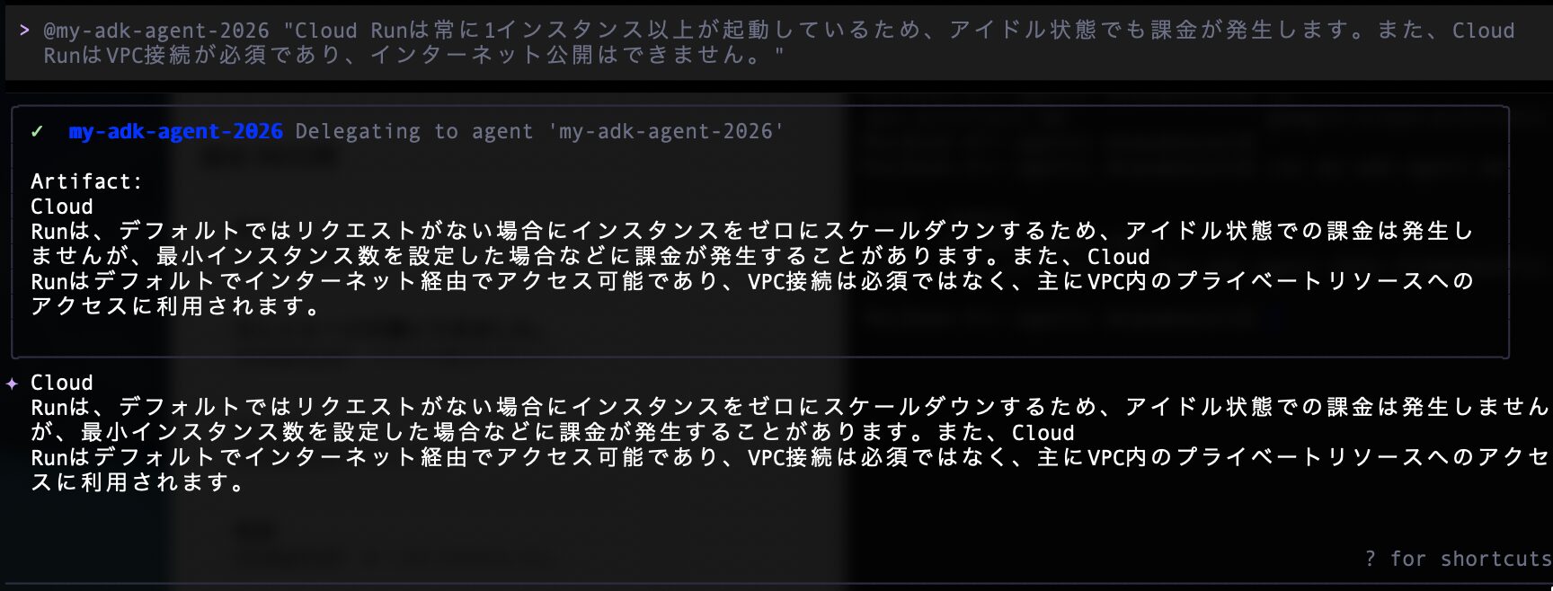╭──────────────────────────────────────────────────────────────────────────────────────────────────────────────────────╮ │ ✓ my-adk-agent-2026 Delegating to agent 'my-adk-agent-2026' │ │ │ │ Artifact: │ │ Cloud │ │ Runは、デフォルトではリクエストがない場合にインスタンスをゼロにスケールダウンするため、アイドル状態での課金は発生し │ │ ませんが、最小インスタンス数を設定した場合などに課金が発生することがあります。また、Cloud │ │ Runはデフォルトでインターネット経由でアクセス可能であり、VPC接続は必須ではなく、主にVPC内のプライベートリソースへの │ │ アクセスに利用されます。 │ │ │ ╰──────────────────────────────────────────────────────────────────────────────────────────────────────────────────────╯ ✦ Cloud Runは、デフォルトではリクエストがない場合にインスタンスをゼロにスケールダウンするため、アイドル状態での課金は発生しません が、最小インスタンス数を設定した場合などに課金が発生することがあります。また、Cloud Runはデフォルトでインターネット経由でアクセス可能であり、VPC接続は必須ではなく、主にVPC内のプライベートリソースへのアクセ スに利用されます。