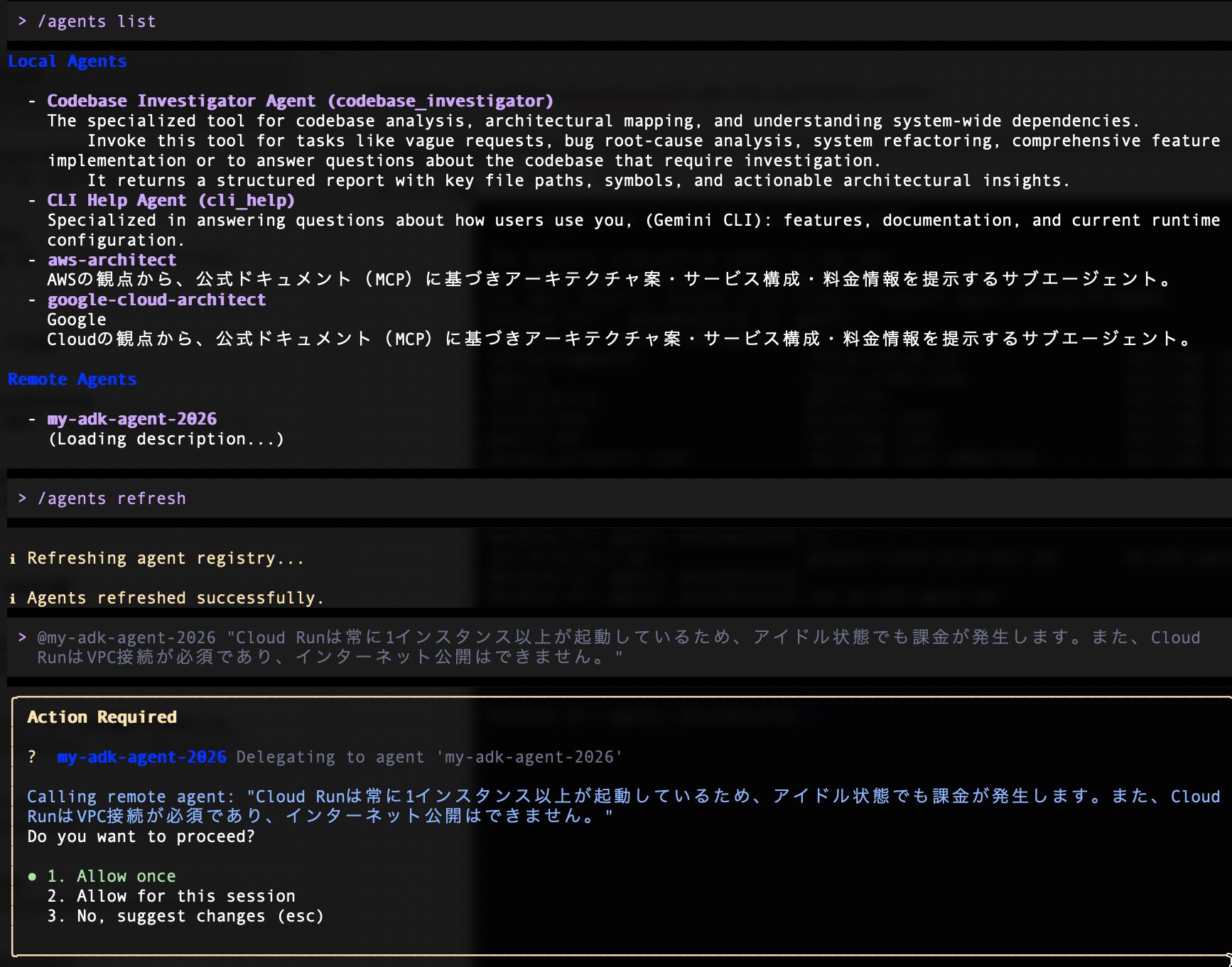 > /agents list 〜〜省略〜〜 Remote Agents - my-adk-agent-2026 > /agents refresh ℹ Refreshing agent registry... ℹ Agents refreshed successfully.