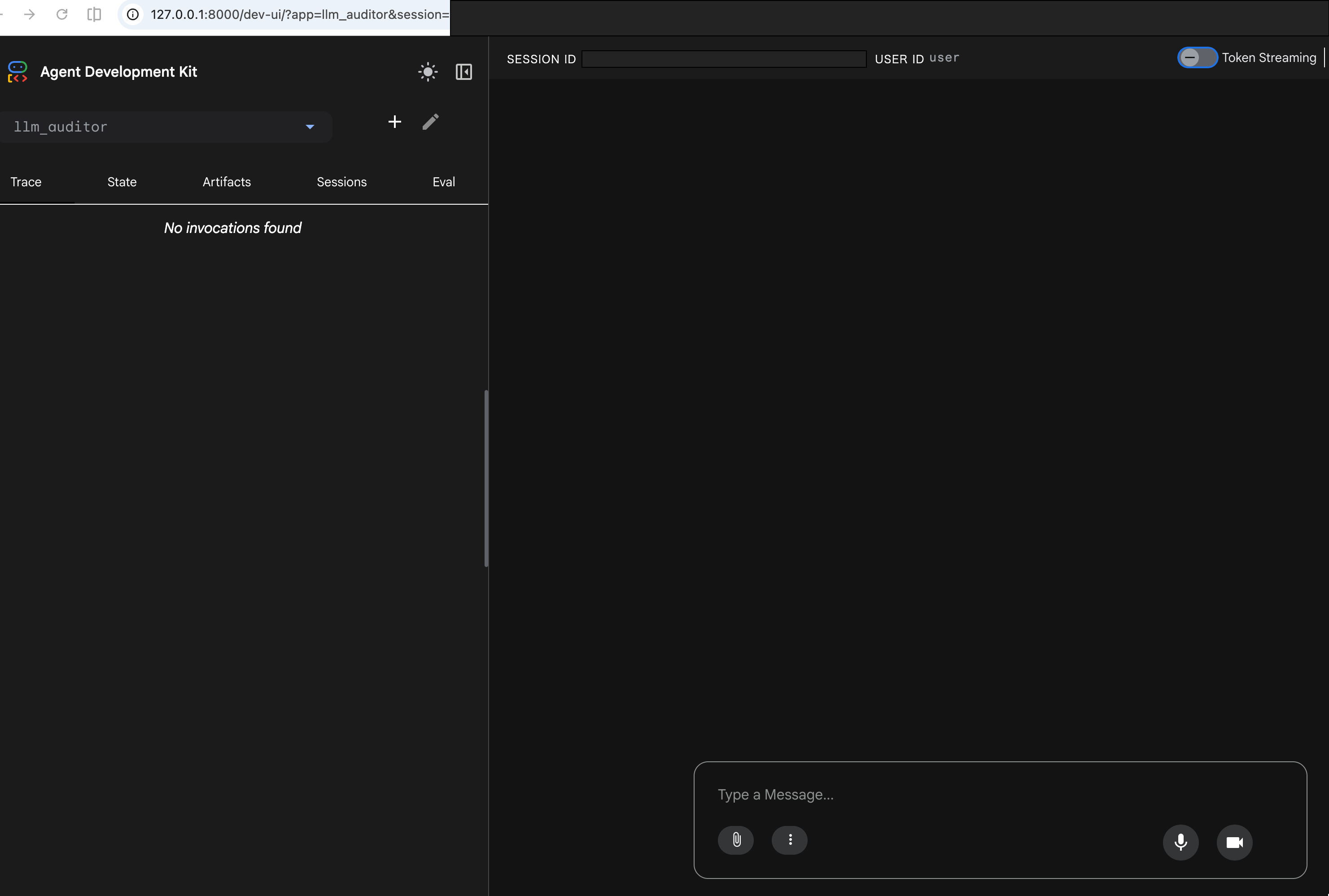 $ pwd /Users/名前/Documents/adk-samples/python/agents/llm-auditor $ adk web 〜〜省略〜〜 INFO: Started server process [15720] INFO: Waiting for application startup. +-----------------------------------------------------------------------------+ | ADK Web Server started | | | | For local testing, access at http://127.0.0.1:8000. | +-----------------------------------------------------------------------------+