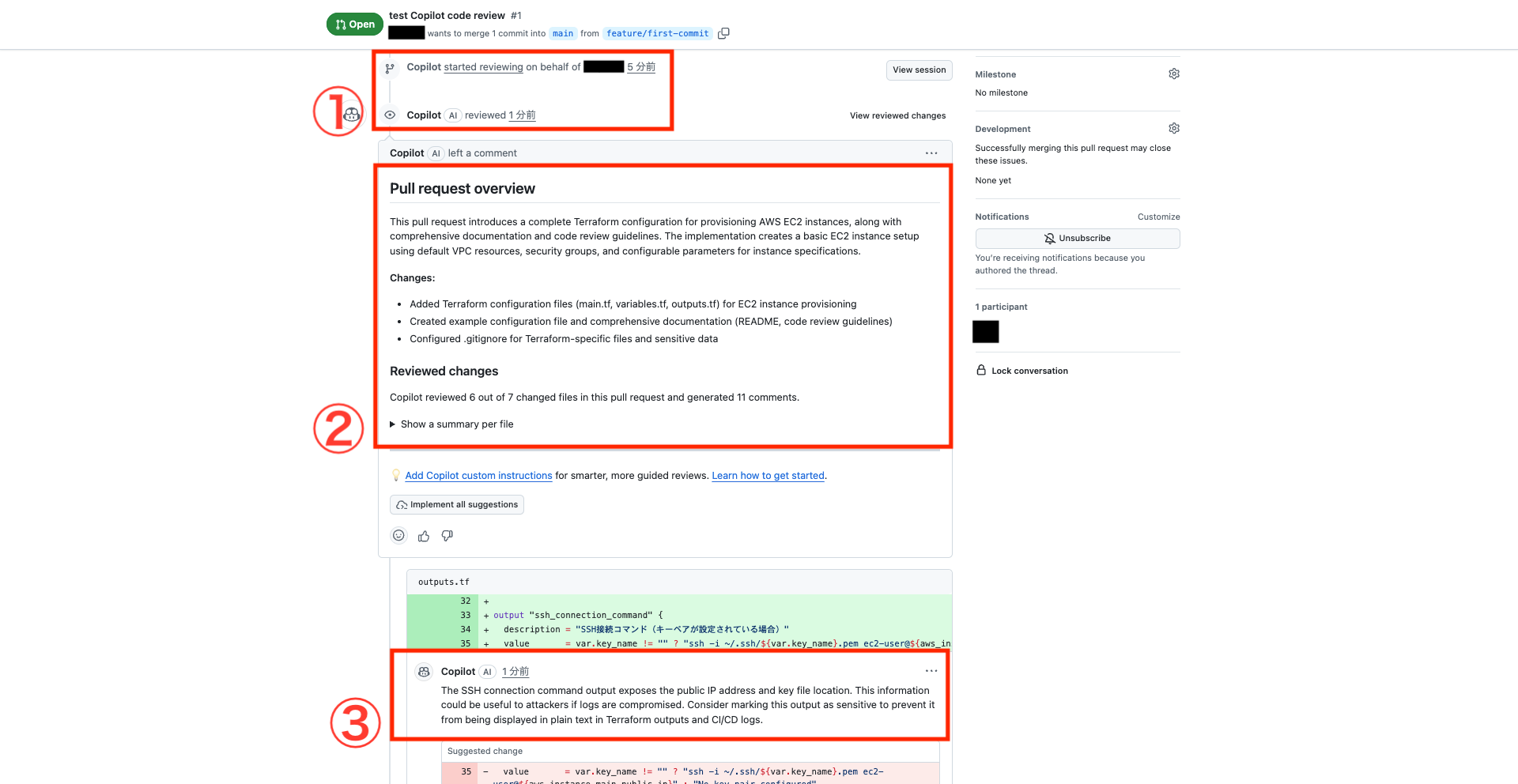 1️⃣ 今回のケースでは、Copilot のレビューが完了するまでに約5分かかった
