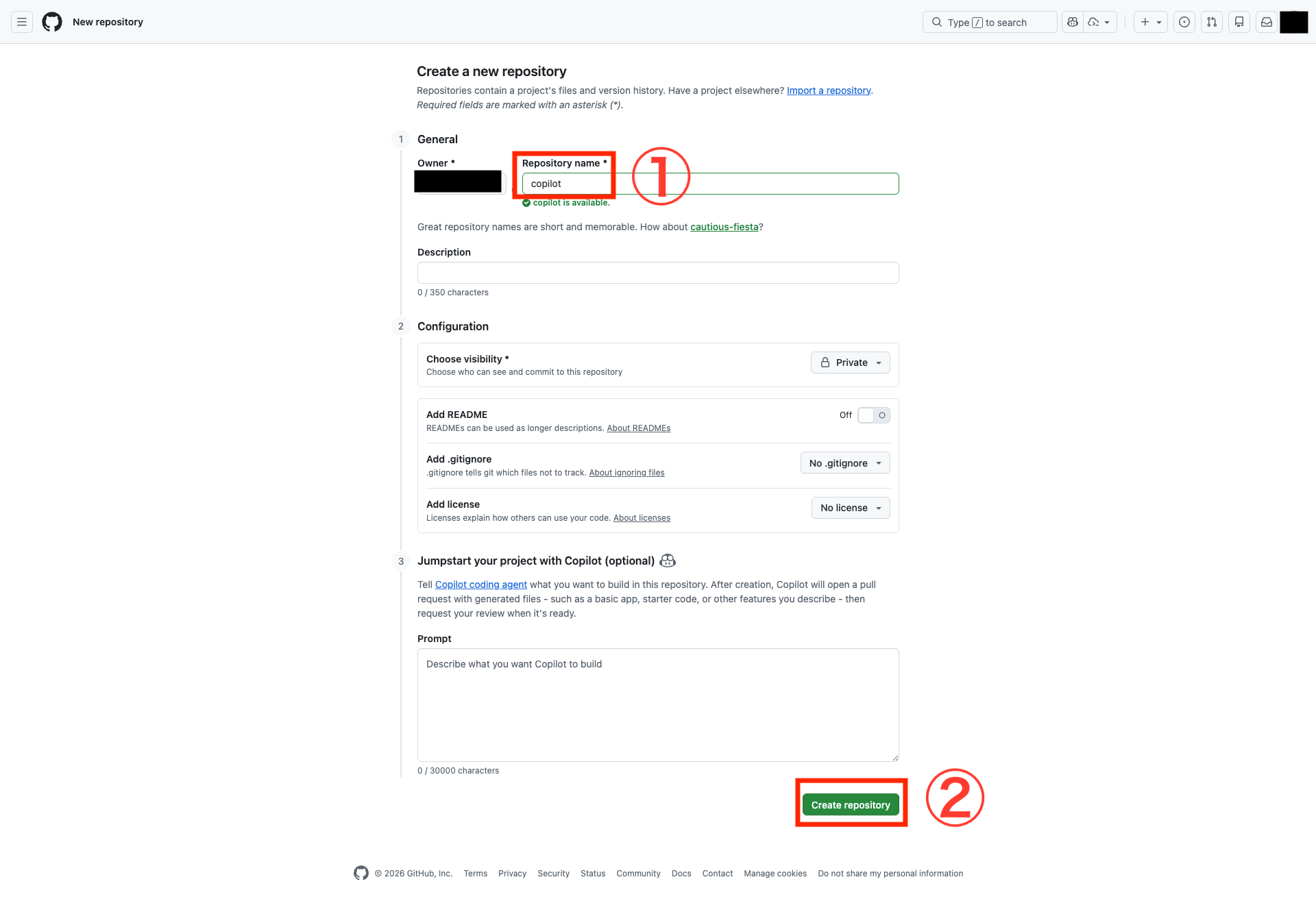 1️⃣ 「Repository name」を入力する(Ownerが組織の場合、別途プラン契約をする必要があるので注意)