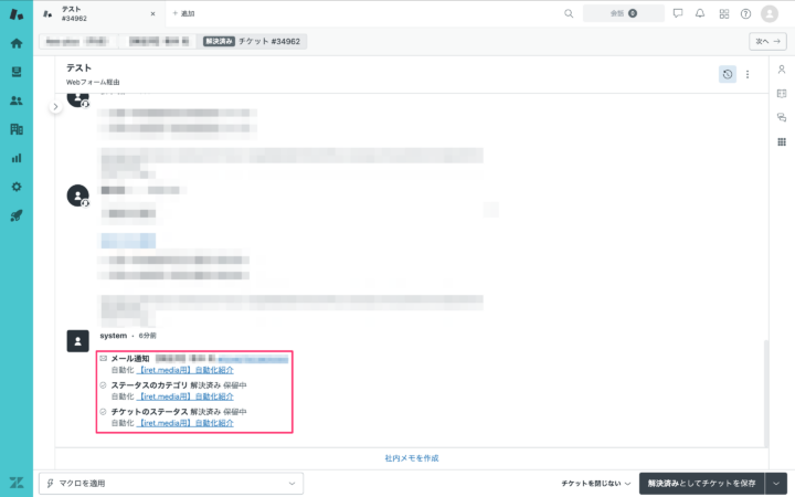 無事に自動化が動作し、チケットのステータスが「解決済み」に変更されていることを確認できました!