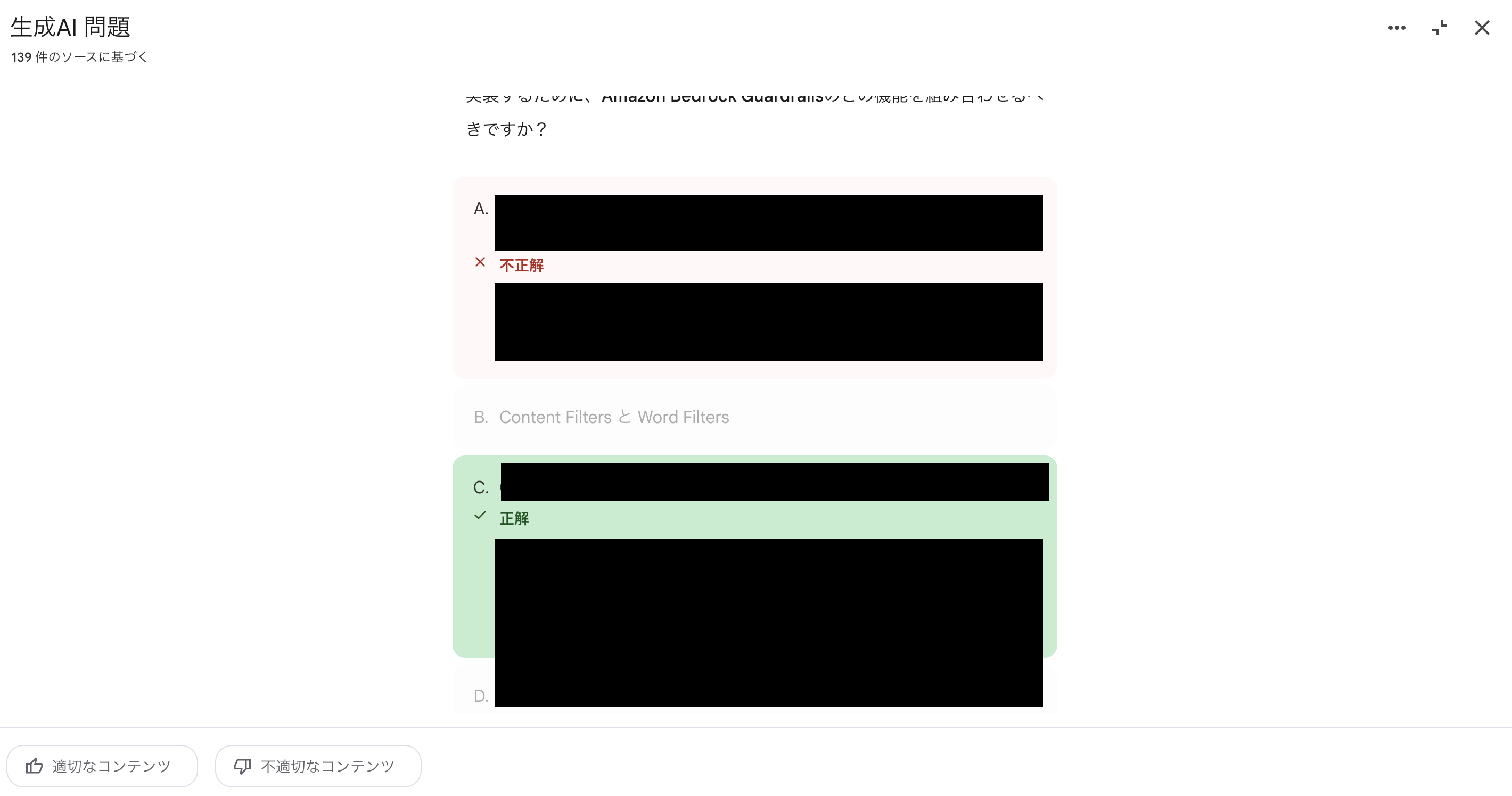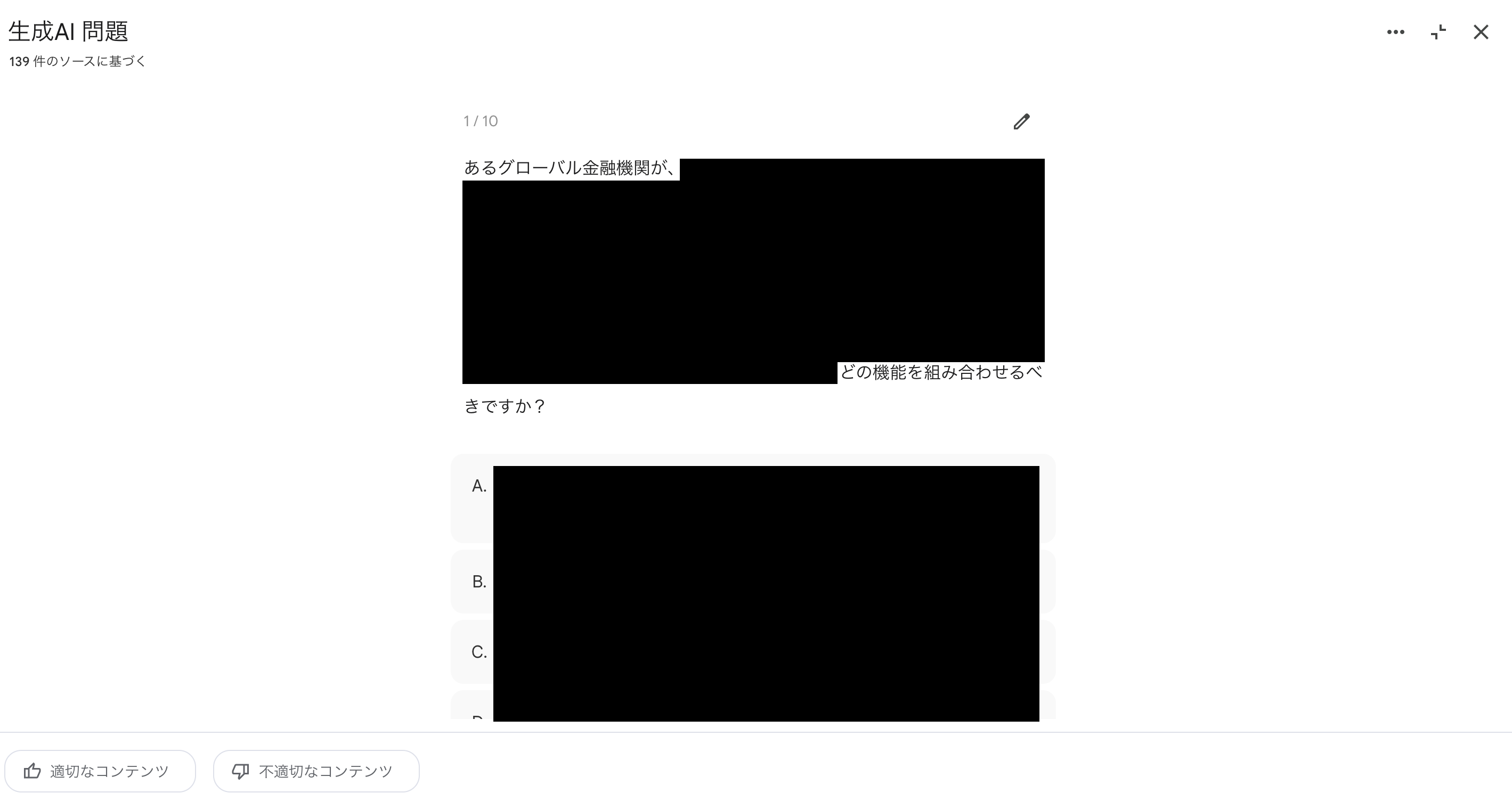 NotebookLMには、読み込ませたソースからプロンプトに従ってクイズを生成する機能があります。これが非常に強力だと感じました。 特に、試験形式に則したアウトプットを出すために、以下のようなプロンプトで指示を出しました。