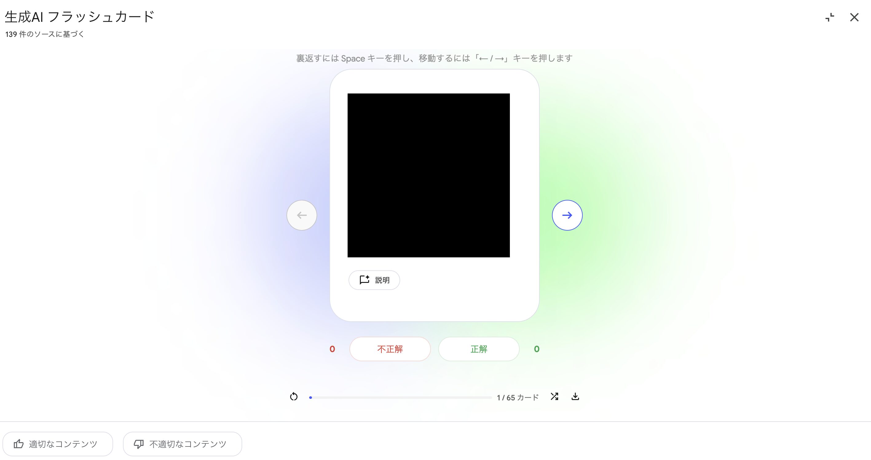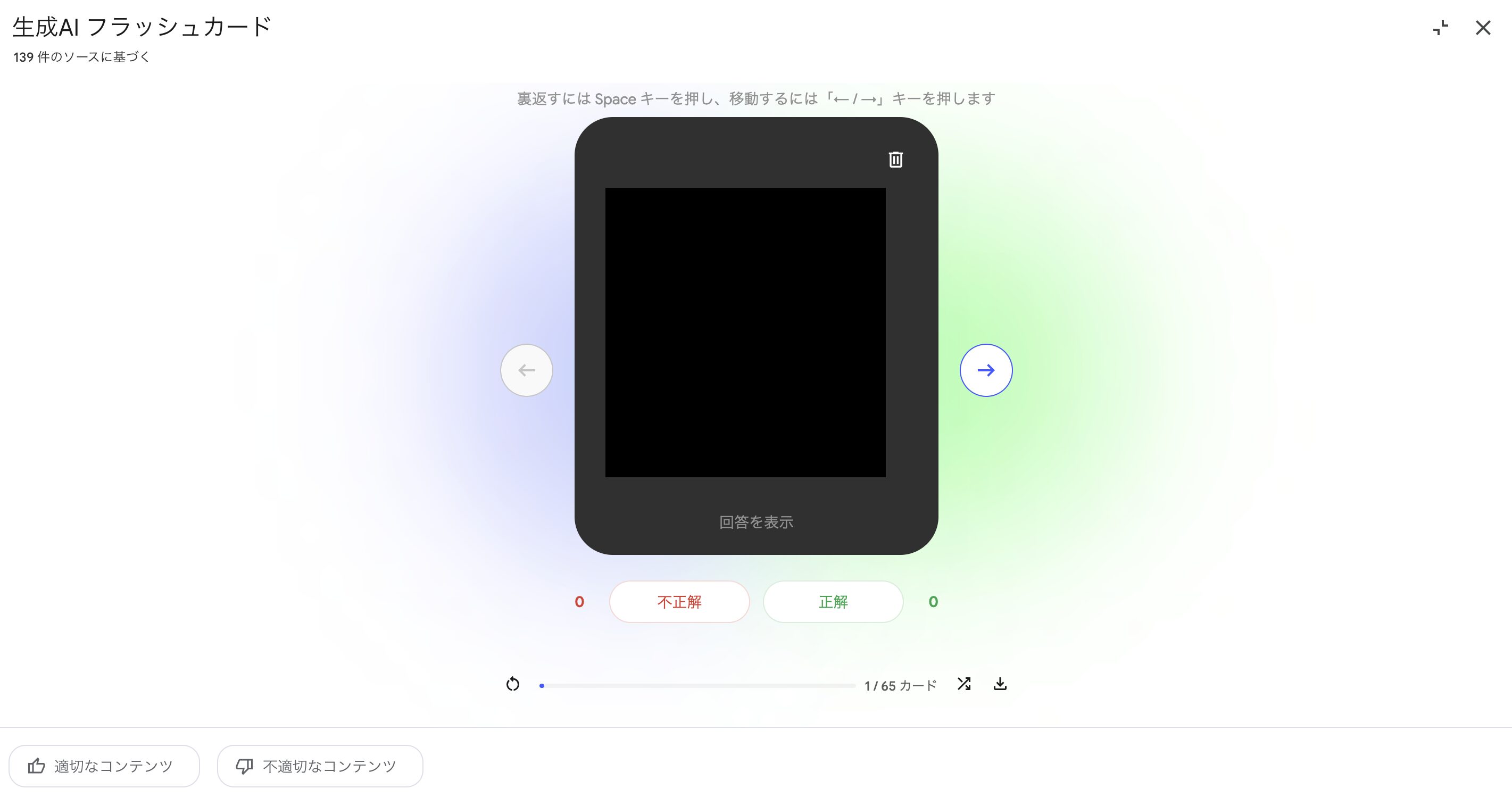 NotebookLMには、読み込ませたソースからプロンプトに従ってフラッシュカードを生成する機能があります。学習初期の段階には重要な用語や概念について、フラッシュカード機能を活用しました。広い試験範囲の内容を効率よく学習することができました。