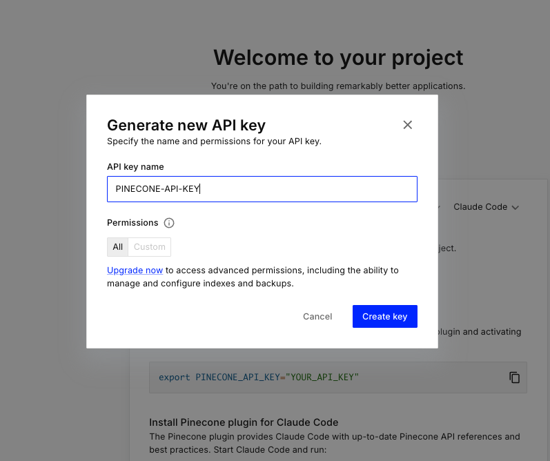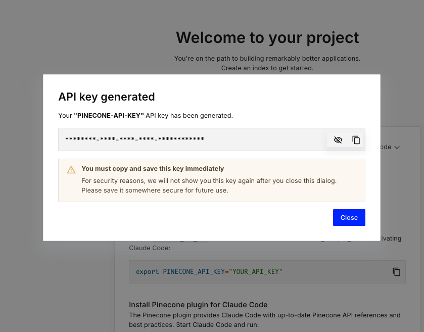 - Pineconeの管理画面からAPIキーを新規作成します
