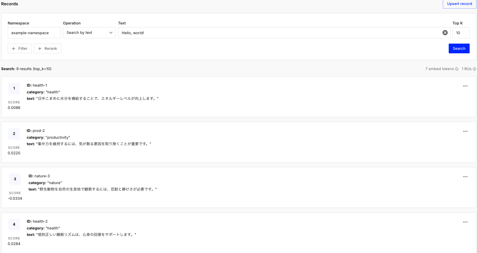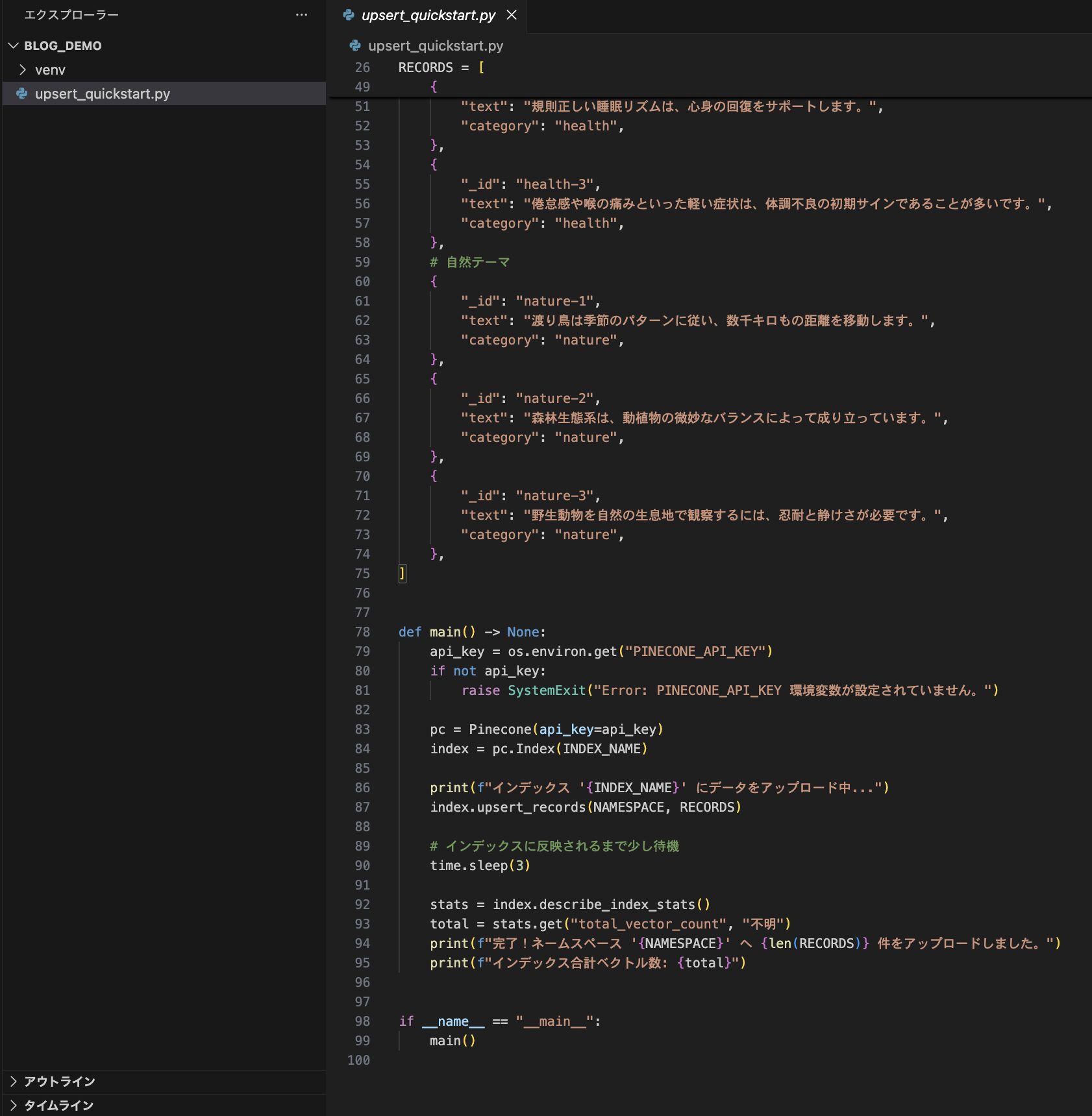 インデックスの作成ができたら、次はデータを追加(Upsert)してみましょう