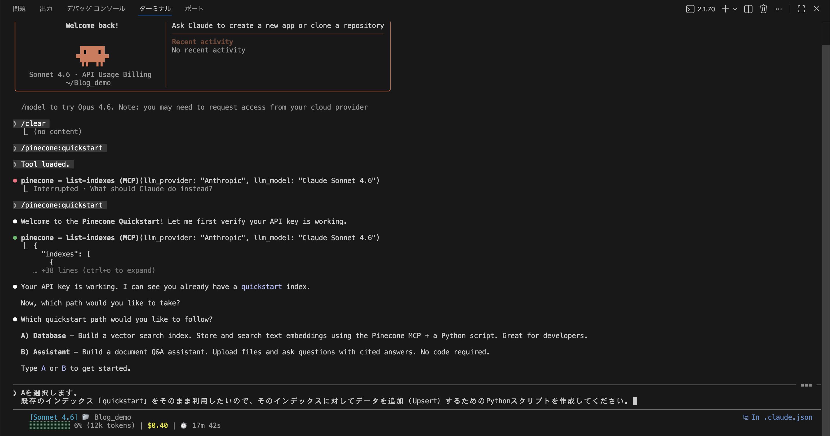 今回は、Claude CodeにあるPineconeプラグインを使用して、データを追加するためのPythonスクリプトを自動生成していきたいと思います