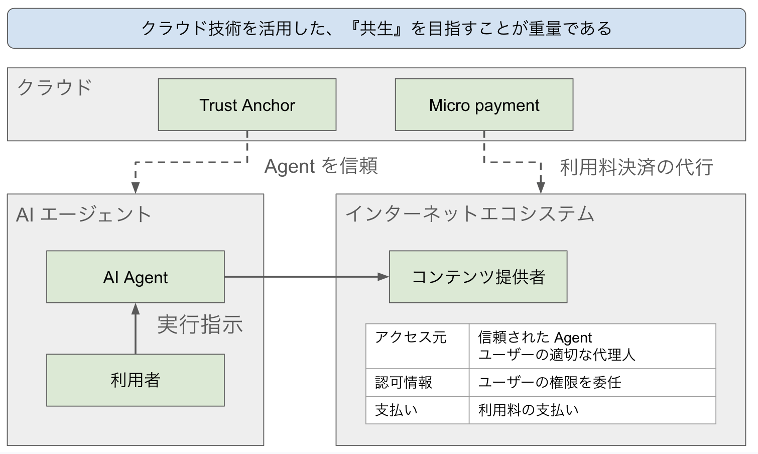 また、AI エージェントを利用する際に広告表示や課金処理が実施されて、その費用がコンテンツ提供者に適切に分配されることで、健全なエコシステムの継続が成り立つと考えられます。