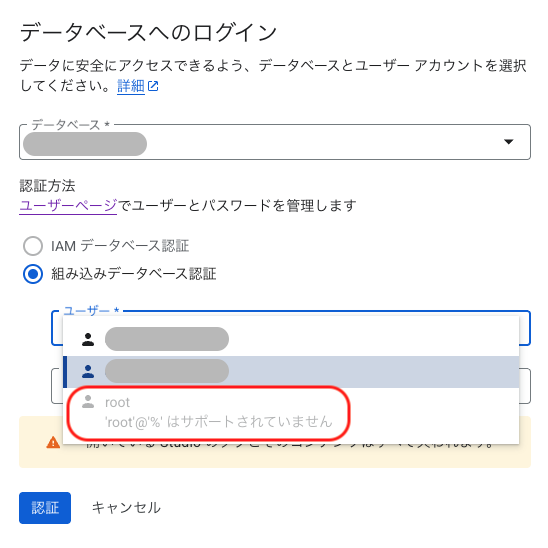 Cloud SQL Studioからrootユーザーでのアクセスはサポートされていないためrootユーザーでのログインはできません。