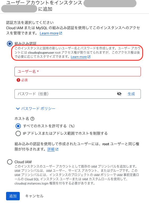 Cloud SQLの「ユーザー」から組み込み認証を選択し、ユーザー名とパスワードを設定してユーザーを作成します。