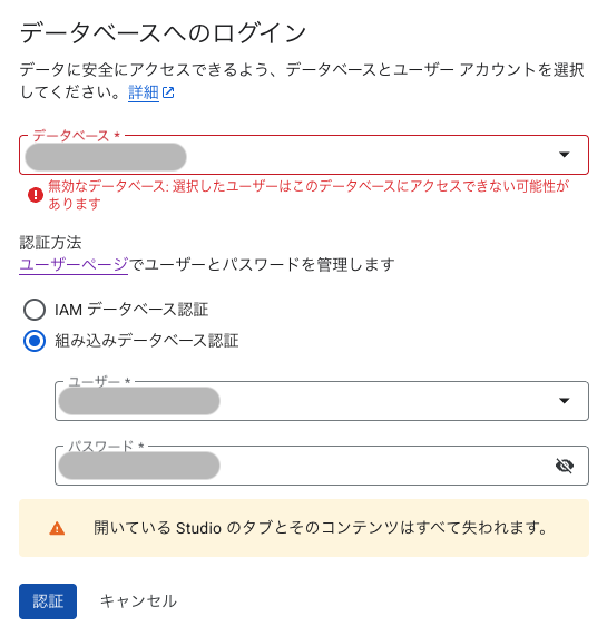| Cloud SQL Studio | root 相当の管理作業が可能 | 権限不足でエラーになりやすい |