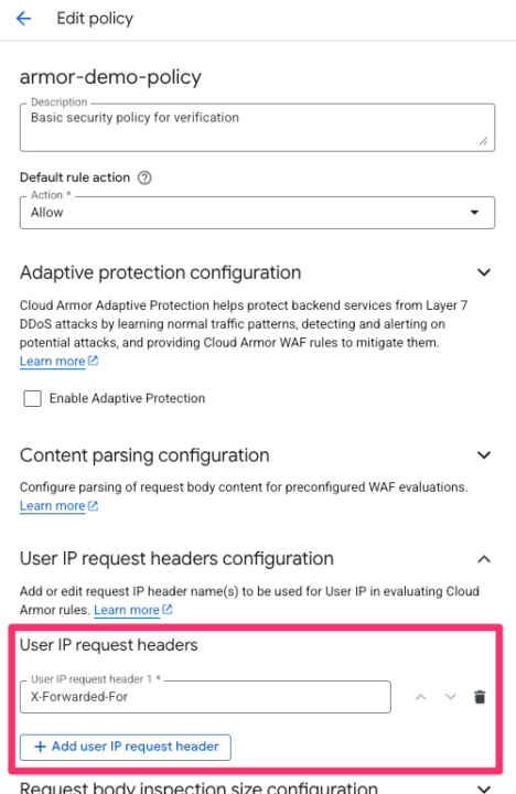Google Cloud コンソールで設定する場合は、セキュリティポリシー編集画面の「User IP request headers configuration」にて、参照したいヘッダー名を追加します。