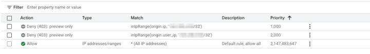 origin.ipを参照する Action: Deny のルールorigin.user_ipヘッダー IP を参照する Action: Deny のルール
