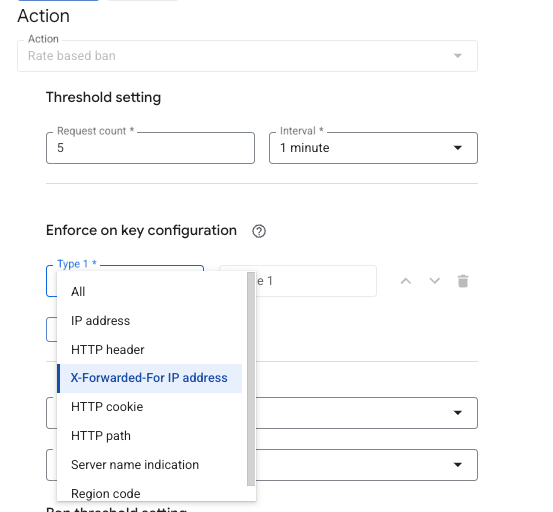 ルールの Action の「Enforce on key configuration」において、Type: X-Forwarded-For IP address を選択します。