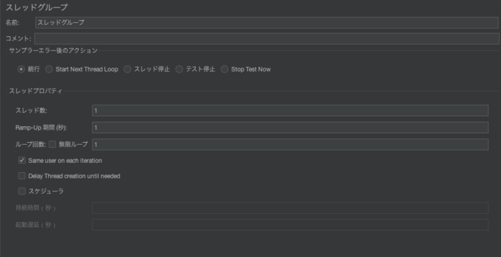 - スレッドグループの追加: テスト計画を右クリック → 追加 → スレッド(ユーザー) → スレッドグループ