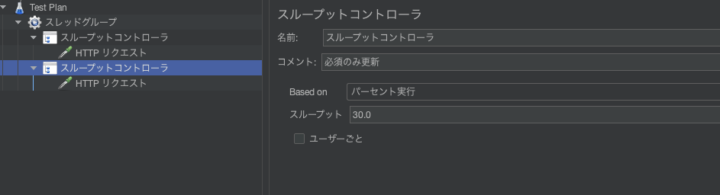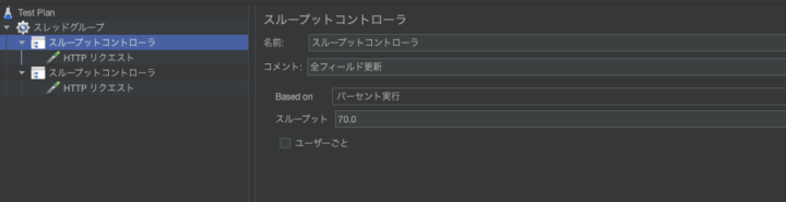 設定方法としてはスレッドグループの中に複数のスループットコントローラを配置し、それぞれに実行割合(Percent Executions)を設定します。