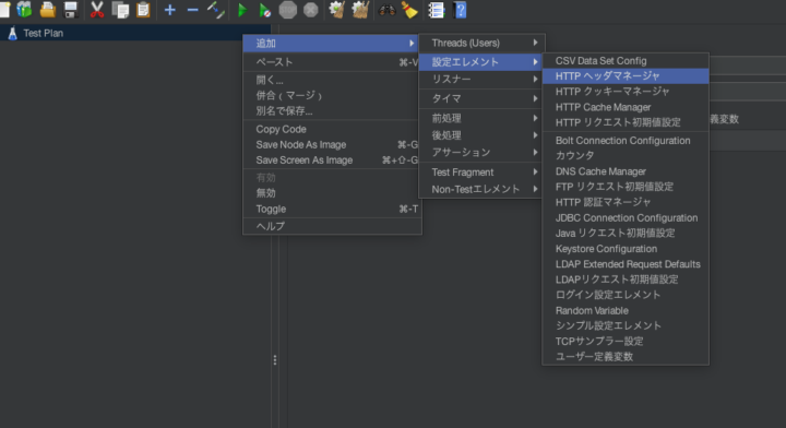 追加方法はHTTPリクエストを右クリック → 追加 → 設定エレメント → HTTPヘッダマネージャから追加できます。