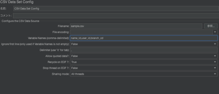 CSV Data Set Configで Variable Names に name_id,user_id,branch_cd と設定すると、リクエストボディで ${user_id} や ${branch_cd} のように変数として参照できます。