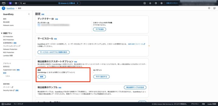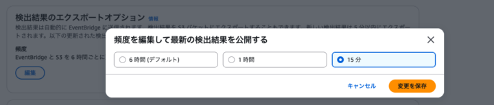 - デフォルト設定の確認: 「検出結果のエクスポートオプション」セクションを見ると、『EventBridge と S3 を 6 時間ごとに更新 (デフォルト)』 と明記されているのがわかります。