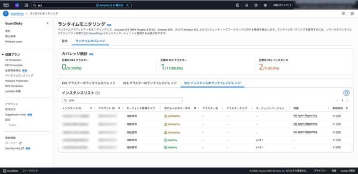 - カバレッジの可視化: 画面上部では、EKSやECS(Fargate含む)、EC2といった各ワークロードごとの監視導入率がひと目で確認できます。 「有効にしたつもり」で漏れているリソースをなくすための、運用に欠かせないダッシュボードです。