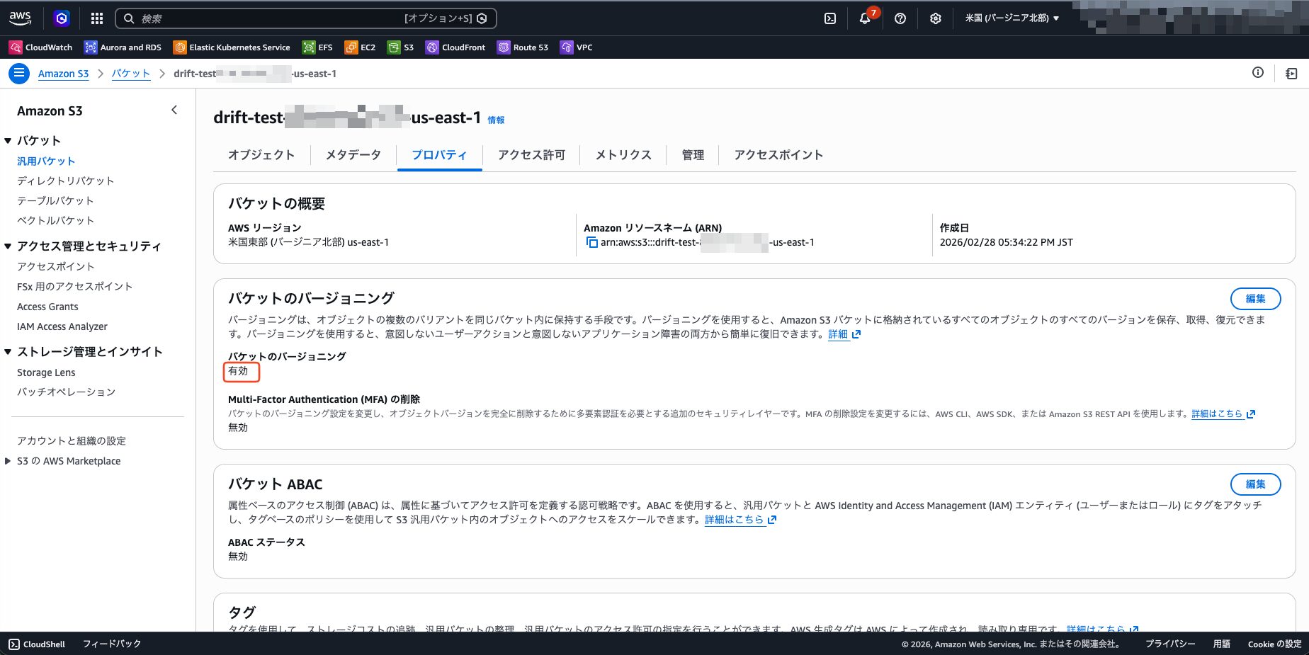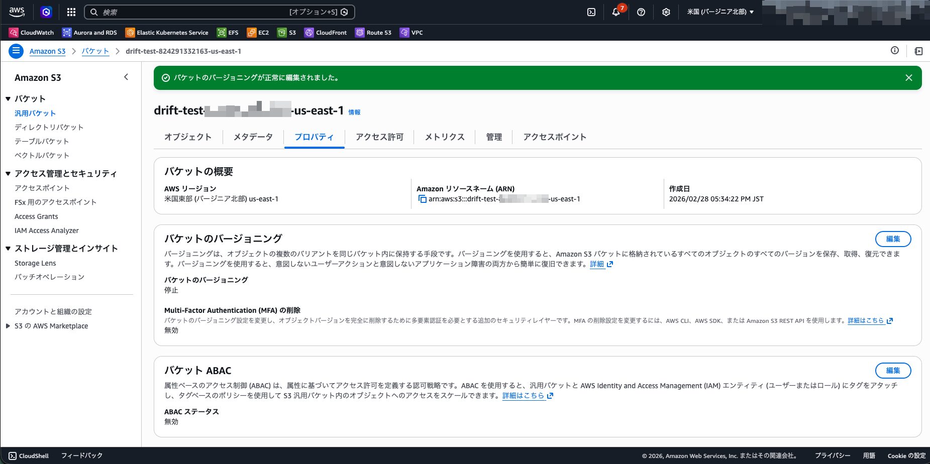 この変更セットを適用すると、S3バケットに対してアップデートが走り、テンプレート上の設定を正とし、S3バケットのバージョニングが有効化されることが確認できました。