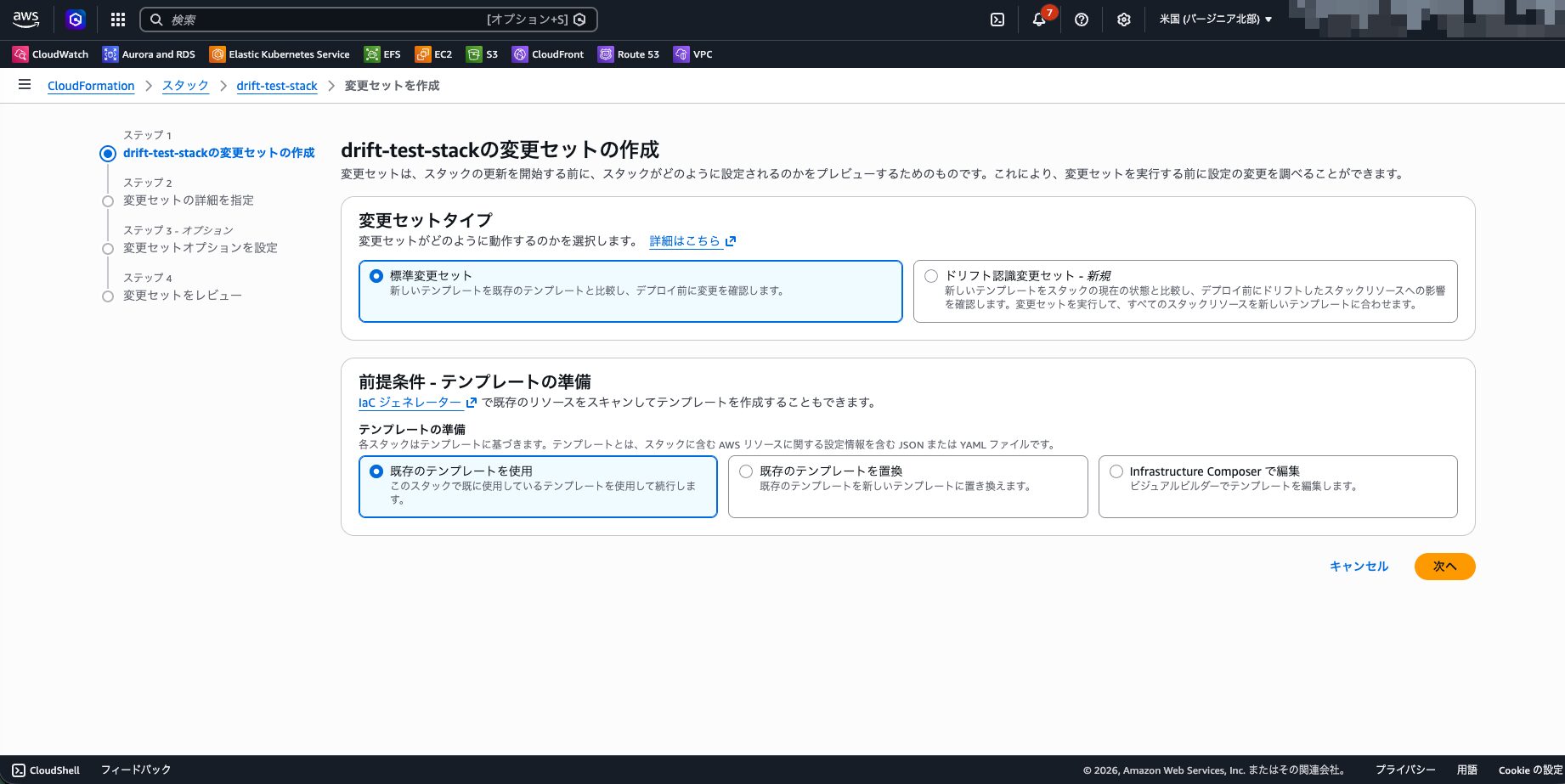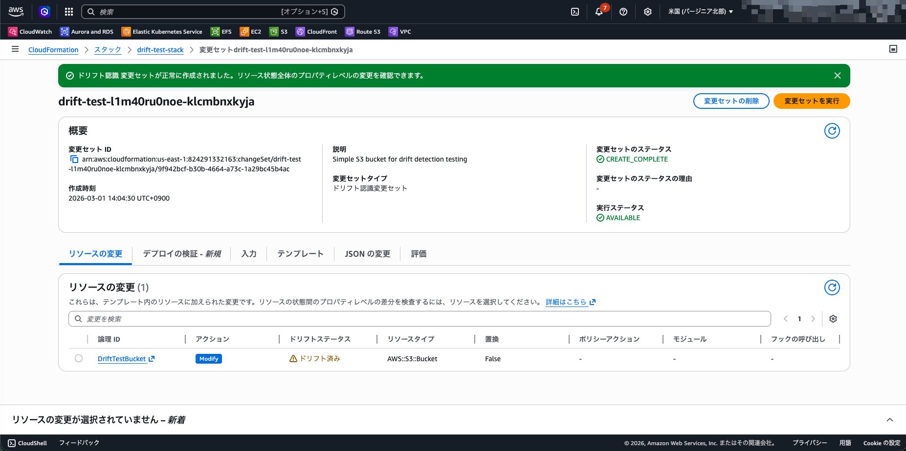 次はS3バケットを管理しているCloudFormation Stackで、ドリフト認識変更セット(新機能)を作成します。