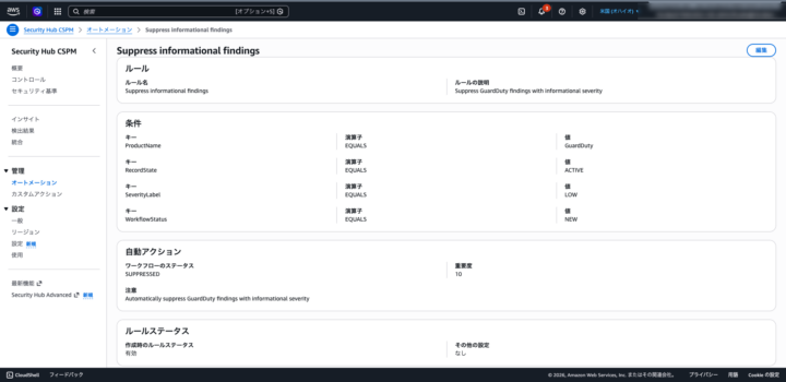 BatchImportFindings)が走った時のみ、オートメーションルールがトリガーされる仕組みです。 - 既存の結果は定期スキャン待ち: ルール作成直後、すでに出ている古いアラートには反映されません。ただし、Security Hub CSPMの結果であれば、システムが 12〜24時間ごと に行う定期スキャンのタイミングで「情報の更新」とみなされ、ルールが適用されます。