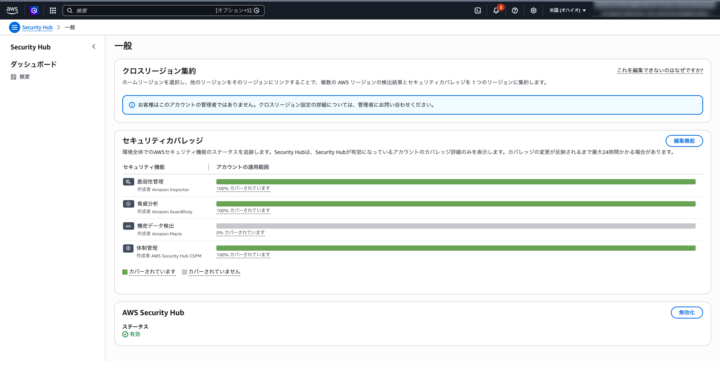 これは「クロスリージョン集約」の設定画面ですが、このようにメッセージが出て設定がロックされているのは、「組織全体のルールに従って、中央でしっかり統制されていますよ」という信頼の印でもあります。もし自分たちで自由に設定を変えたい時は、管理者に相談が必要になります。