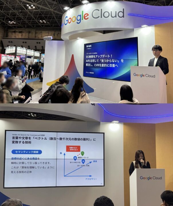そこでアイレットは、Google Cloud の生成 AI 技術「Vertex AI Search for commerce」を活用した次世代の EC 検索ソリューションとして、セマンティック検索※を活用したデモを展示。