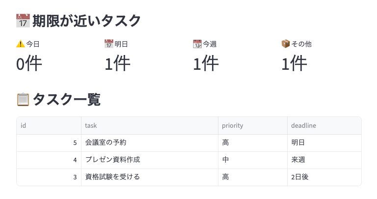 「発表は木曜日だからまだ大丈夫かも」というニュアンスから、優先度を「中」と判定しています。 - ダッシュボード: