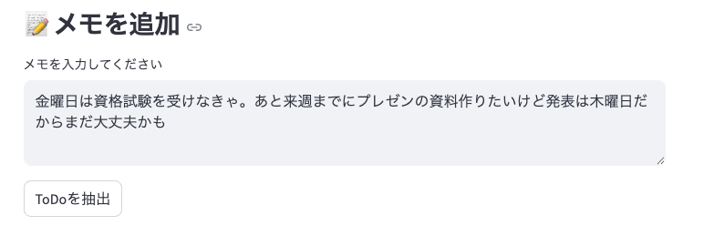 ユーザーがメモ入力欄に「明日までに〇〇やらなきゃ!△△は来週でもいいかな」といった内容を入力して送信します。まずは、頭の中にある「やらなきゃいけないこと」をそのまま入力します。