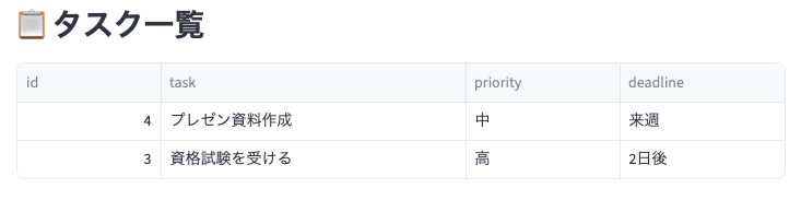 メモを書いて送信すると、優先度や「明日」という言葉を実際の日付に変換してDBに保存してくれました✨